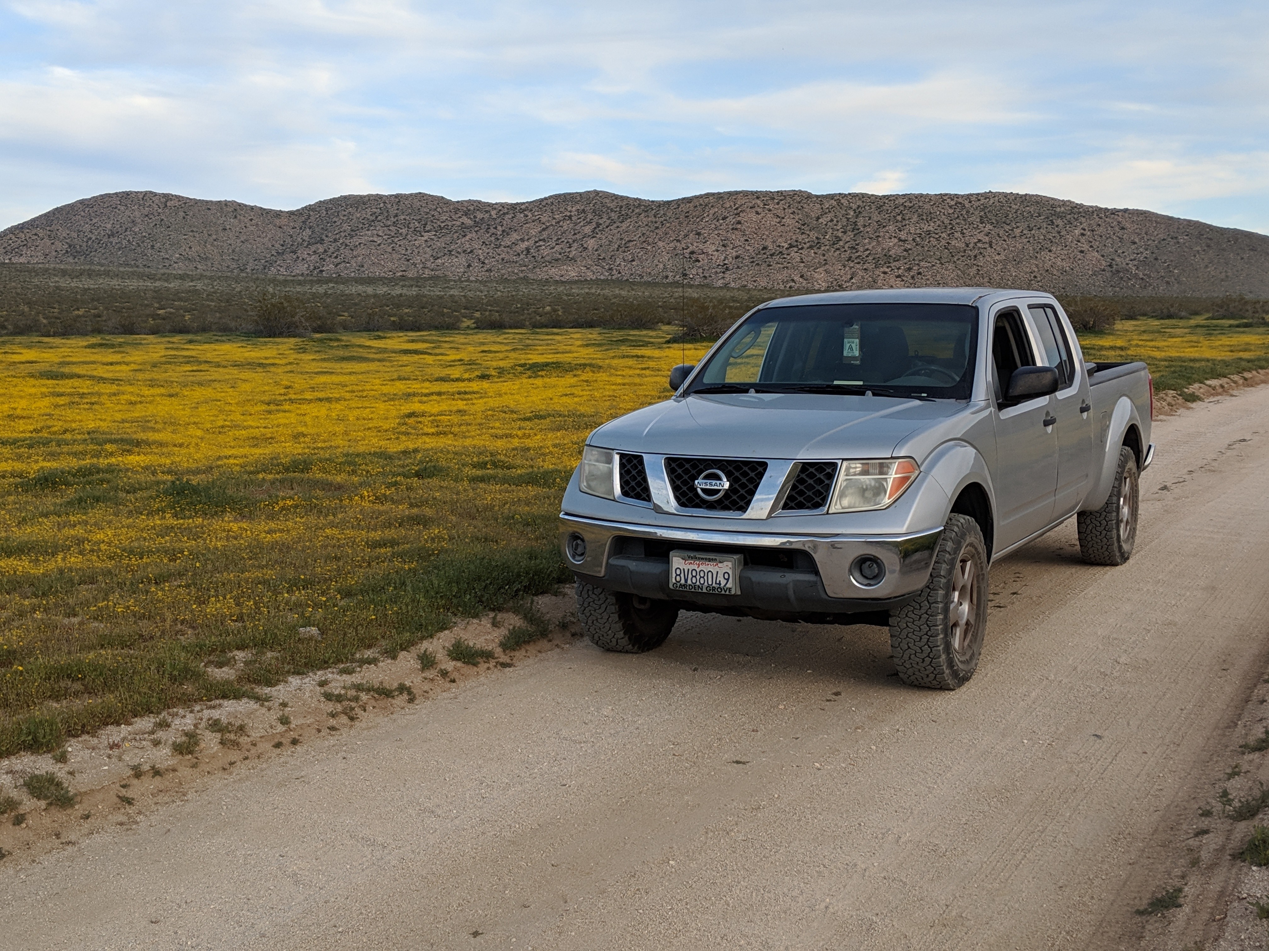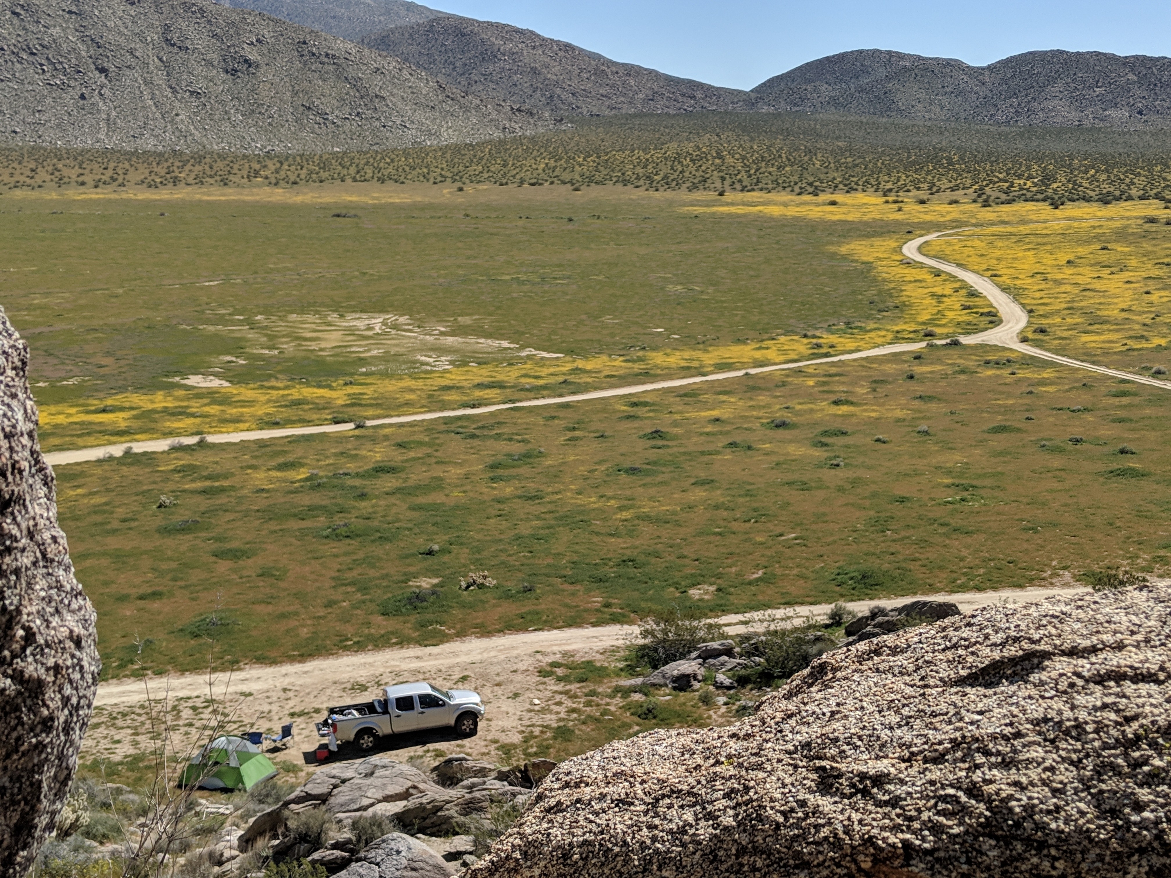 My brother made a quick trip out to Anza Borrego, CA this past week to get a glimpse of the wildflower superbloom and do some dispersed camping. Being late spring after huge rains, it was bound to be an extremely busy weekend out there. Instead of staying near the crowds around Borrego Springs, he followed one of the trails in my Guide to California Backroads & 4-Wheel Drive Trails book (highly recommended) and got away from people.